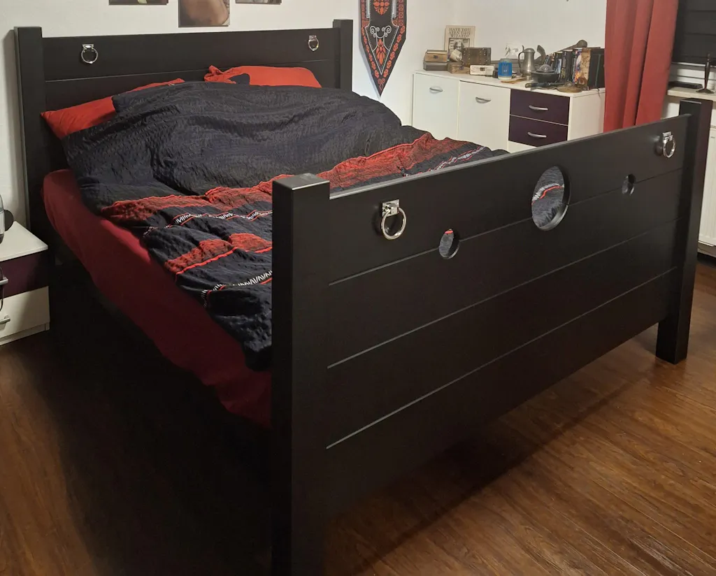 Luxury solid wood bed frame handcrafted for comfort, durability, and modern interiors. Designed with discreet dual-use features ideal for alternative lifestyles, adventurous couples, or private play. Premium finish, versatile function, built for those who live differently.